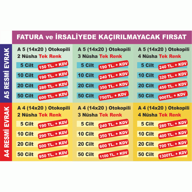 Profesyonel Fatura Baskı A5 – A4 hizmeti ile işletmenize uygun ticari evrakları en kaliteli şekilde hazırlıyoruz. Sipariş vermek ve fiyat bilgisi almak için bizimle iletişime geçebilirsiniz.