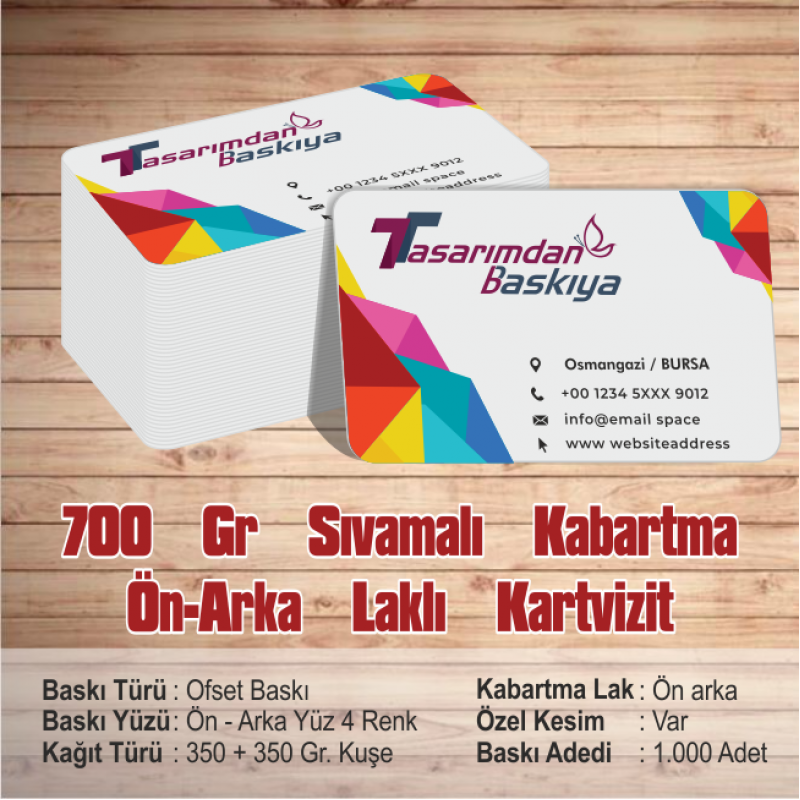 Ön Arka 4 renk ofset baskı olan tek taraf baskılı, kuşe sıvama kartvizit standart 1000 adet olarak üretilir. Baskı sonrası uygulama olarak kartvizit'in ön arka tarafına da parlak mat kaplanır. Bursa matbaa baskıda kullanılan kartvizit kağıdı ise 700 gr/m² Kuşe kartondur.