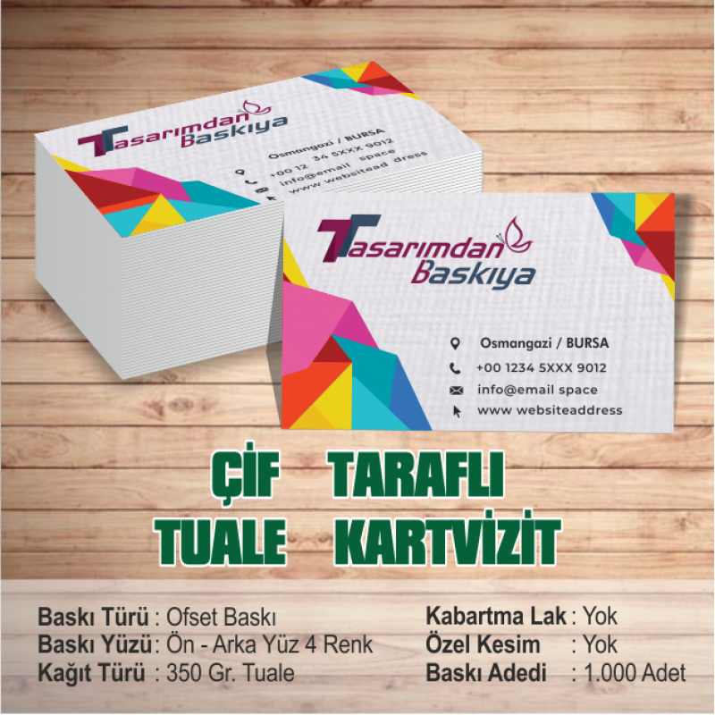 Ön Arka 4 renk ofset baskı olan tek taraf baskılı, tuale kartvizit standart 1000 adet olarak üretilir. Baskı sonrası uygulama olarak kartvizit'in ön arka tarafına da parlak mat kaplanır. Baskıda kullanılan kartvizit kağıdı ise 350 gr/m² Tuale kartondur.