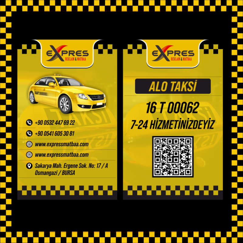 takisici kartvizitleri üzerinde ad soyad, telefon, plaka ve isteğe bağlı QR kod yer alabilir.