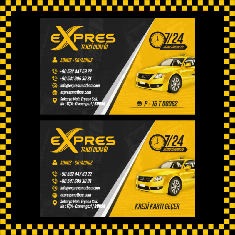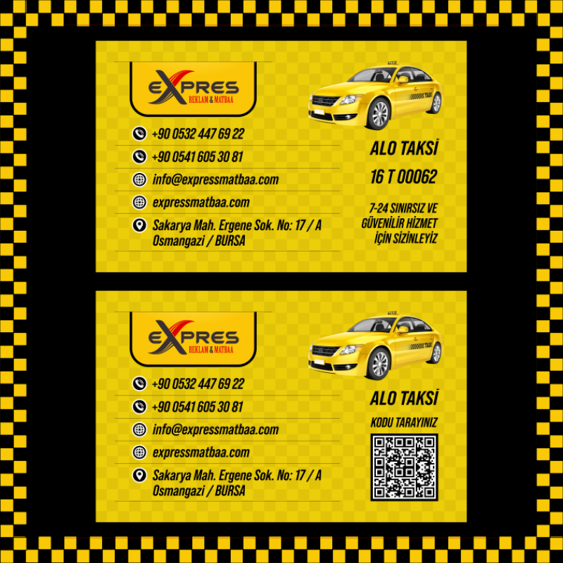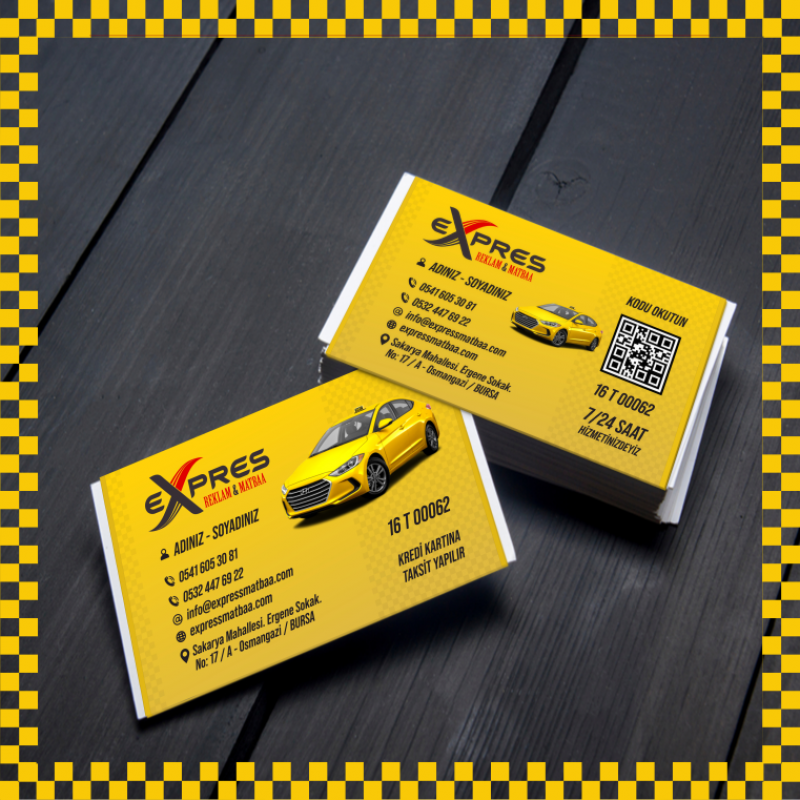 Taksici kartvizit modelleri, bireysel taksiciler ve taksi durağı çalışanları için özel olarak tasarlanmış, sade ve dikkat çekici ürünlerdir. Yolcuların sizi kolayca tekrar arayabilmesi için taksici kartvizileri gerekli tüm bilgiler net ve okunaklı şekilde sunulur.