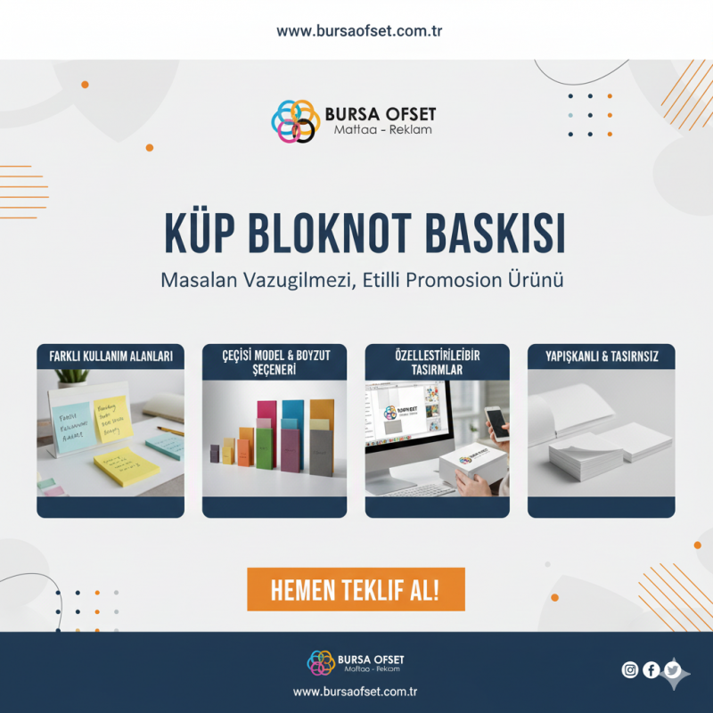 Logolu küp bloknot, kurumsal promosyonların vazgeçilmez unsurlarından biridir. Masaüstünde sürekli görünen küçük ama etkili bir reklam aracı olan küp bloknotlar; ofislerde, resepsiyonlarda, bankolarda ve fuar stantlarında marka görünürlüğünü artırır. Bu içerikte küp bloknot baskı seçenekleri, yaygın küp bloknot ölçüleri, baskı teknikleri ve güncel küp bloknot fiyatları nı ayrıntılı şekilde ele alıyoruz.